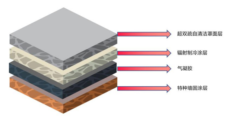 新一代隔热体系由气凝胶、辐射制冷涂层和超双疏自清洁纳米涂层组成。